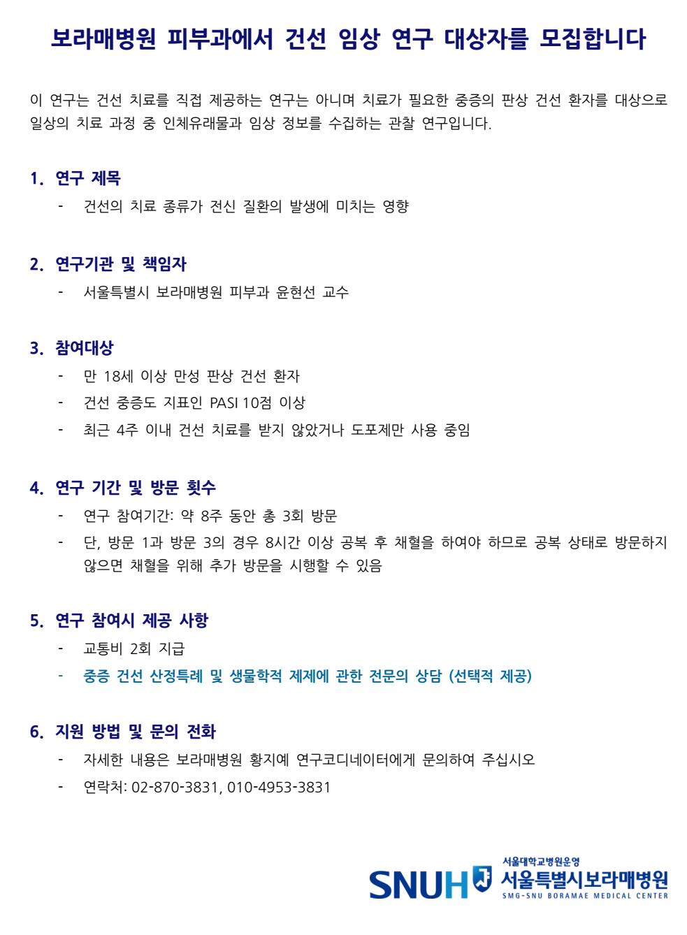 서울대 보라매병원 피부과 윤현선 교수님께서 진행하는 건선 임상 연구 대상자 모집 참여 안내입니다.
